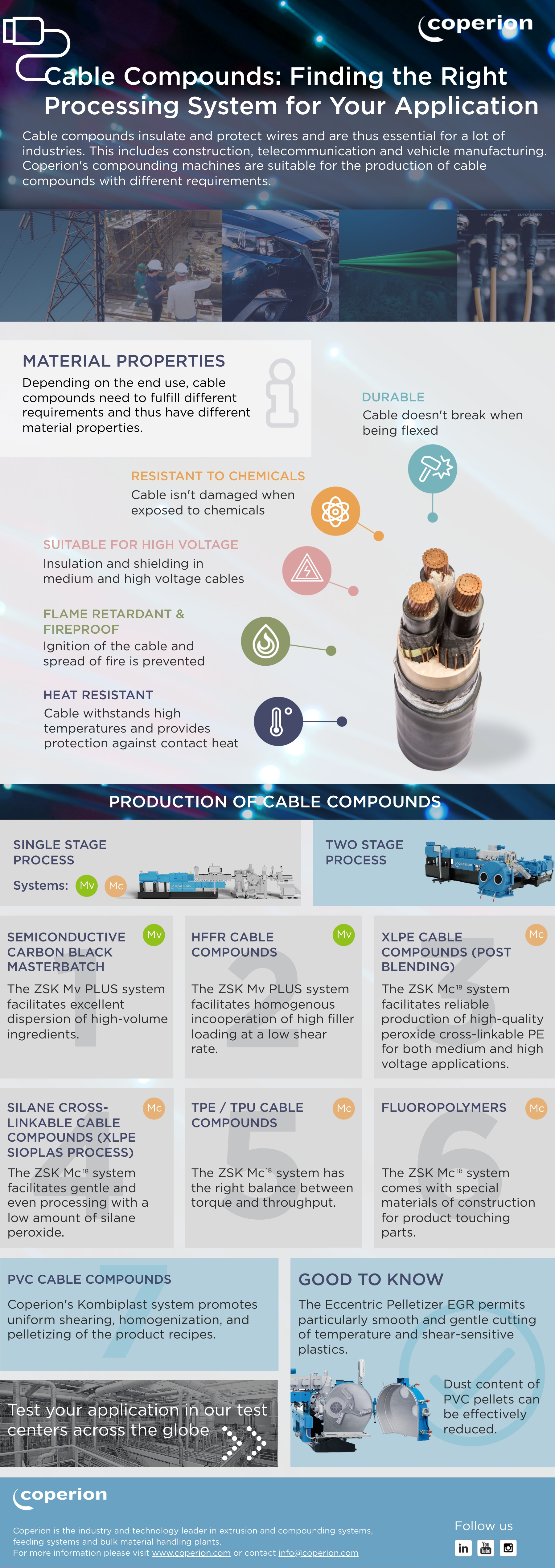 Als Hersteller von leistungsstarken Doppelschneckenextrudern verfügt Coperion über jahrzehntelange Erfahrung in der Herstellung von Kabelcompounds und bietet die richtigen Maschinen und Lösungen für das Isoliermaterial Ihrer Kabel. Erfahren Sie mehr in der folgenden Infografik.