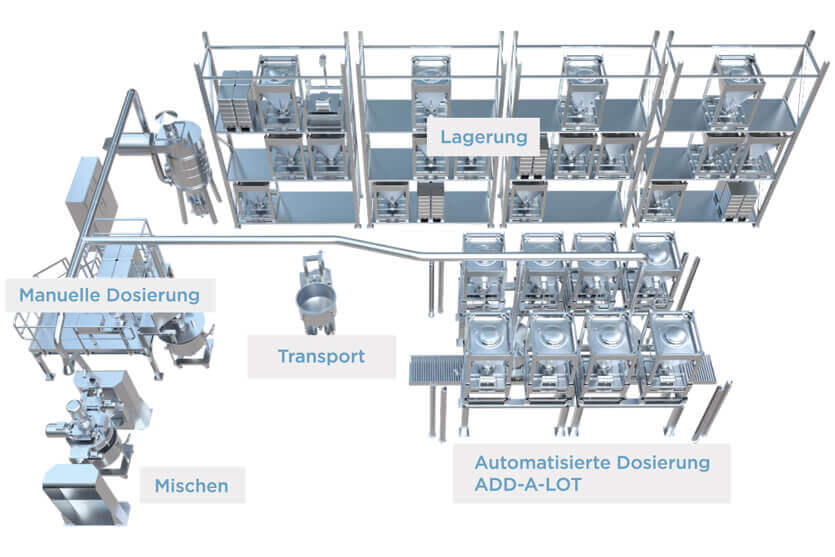 Multi-Ingredient Handling Systeme (MIH-Systeme) umfassen alle Schritte von der Ankunft der Komponenten, über ihre Dosierung bis hin zur Herstellung der Vormischungen (Premixes). Die gravimetrische Dosierung erfolgt abhängig von der Menge und der geforderten Genauigkeit manuell oder automatisiert. Um einen effizienten Anlagenbetrieb zu ermöglichen, umfassen MIH-Systeme auch intralogistische Anwendungen rund um die Premixherstellung. Coperion unterstützt Sie beim Aufbau eines MIH-System als Teil Ihrer Compoundieranlage.