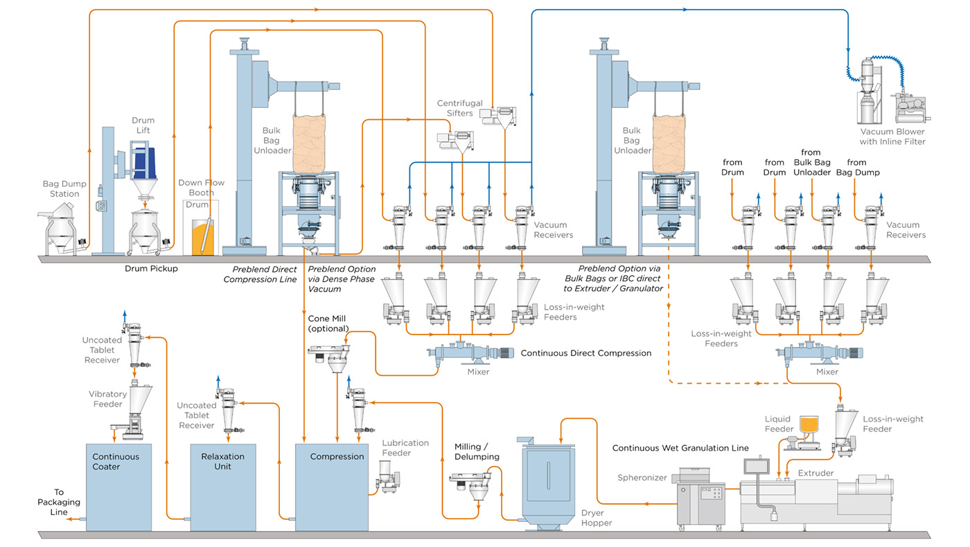As the pharmaceutical industry continues to accelerate the current paradigm shift in pharmaceutical processing from batch to continuous, Coperion and Coperion K-Tron have continued to be technology leaders in this mode of manufacture. Our high-accuracy loss-in-weight feeders, integrated pneumatic refill systems, and continuous pharma extruders have become critical components of various continuous and semi-continuous processes, such as continuous direct compression, continuous wet and dry granulation and hot melt extrusion, milling and micronization, and continuous coating. Our loss-in-weight feeders, pneumatic systems and extruders are available in hygienic easy clean executions, with options on various modes of product containment, cleaning, and accessibility. Extensive continuous process knowledge, as well as design expertise in handling even the most difficult excipients and active ingredients have made Coperion and Coperion K-Tron the industry leaders in continuous manufacturing technology.