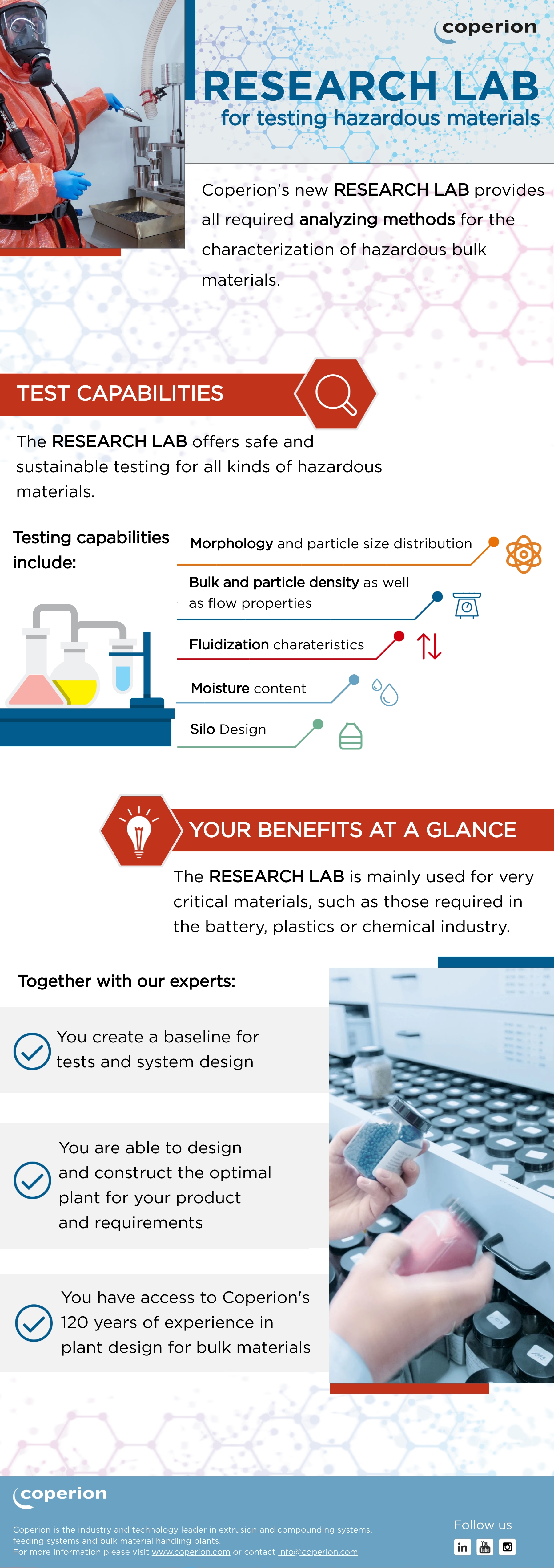 Hazardous materials are commonly used in various industrial processes – especially in the production of chemicals, plastics or batteries. Due to their toxic properties, both plants and research laboratories need to comply with strict safety standards to protect both workers and the environment. In addition to our test center for bulk material handling, Coperion offers a fully equipped research lab for hazardous materials such as ternary cathode materials (CAM) at our site in Niederbiegen, Germany. Learn more about our test capabilities in the following infographic: