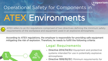Some production areas are at a constant risk of explosion. To mitigate this risk and protect workers, both the production equipment and overall operations need to fulfill high safety standards. ATEX refers to EU regulations defining the minimum safety requirements of the workplace and the equipment used in a potentially explosive atmosphere.