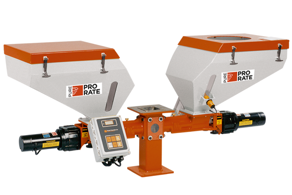 Designed for on-machine feeding and mixing, ProRate™ PURE Feeders/Blenders and ProBlend™ Mixers are ideally suited for feeding mixed bulk material in plastics injection or extrusion feeding applications. The volumetric ProRate PURE I and ProRate PURE II feeders can be combined with a simple Gravity Mixer or the more sophisticated ProBlend Mixer for metering an exact and constant material mix into the processing machine. Where higher accuracy is required, the ProRate PURE Blender offers continuous gravimetric blending by adding a scale to each ProRate Feeder.